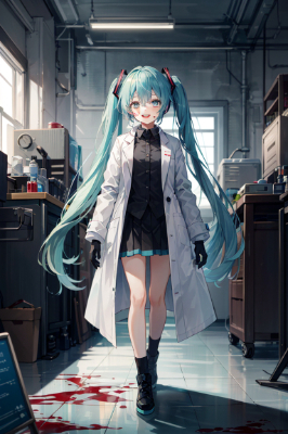 masterpiece, best quality, extremely detailed, anime, girl, ,suitIllustration of Hatsune Miku, vocaloid, 1girl, twin tails, long hair, blue hair, green hair, blue eyes, and a mad doctor girl. Scientist-like figure wearing a white coat, goggles, and gloves. Her hair is slightly disheveled, and she has a crazy smile on her face. Strange machines, experimental equipment, and chemicals line up in the background, creating an eerie atmosphere of the laboratory. A white coat with blood on it, and there is blood on the floor and walls.