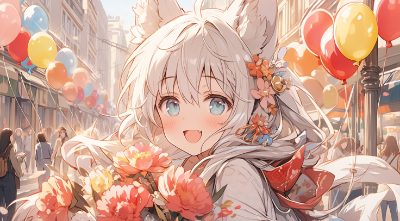水しぶきが弾ける中、明るく笑う狐耳の少女は、夏の海を全力で楽しんでいる。カラフルな浮き輪と星型のアクセサリーが、まるで空に浮かぶ星々のように彼女の周りを彩り、陽射しを浴びたその笑顔は、見る者に無邪気な夏の楽しさを思い出させる。
