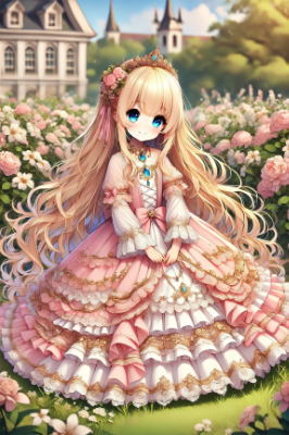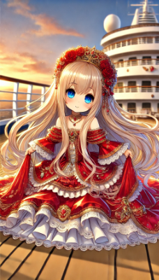 「1人のとても小柄な女性。とても背の低いお姫様で、とても長く明るい金髪、とても長くまっすぐ流れるようなストレートヘア。身長はとても低く、赤色のロングドレスにはたっぷりとフリルが幾重にも重なり、長袖の赤色のロングドレスは多くのフリルとレースと刺繍で豪華に飾られている。スカートの裾やウエスト部分にもフリルとレースと刺繍の装飾が豪華に施されて、裾まで華やかに広がっている。金銀や宝石のアクセサリーを多く付けている。非常に小柄な女性で可愛く、顔を赤くして優しく微笑んでいる。非常に低い背であり、豪華客船の屋外デッキに立って、可愛いポーズをしている。非常に長く明るい金髪が広がっている。青い目。時刻は夕方。全体がアニメ風に描かれ、非常に詳細な描写。アスペクト比は縦長」の絵を描いて