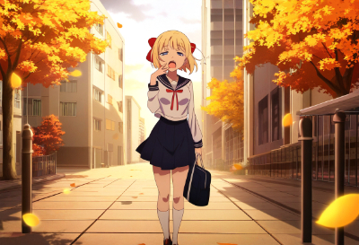 1girl,solo,blonde hair,short hair,blue eyes,(hair bow,red bow:1.2),happy,walking outdoors,t-shirt,funky pattern,half pants,sneakers,cheerful expression,(full body:1.2),casual pose,summer day,city street,pedestrians,buildings,urban scenery,sunlight,clear sky,(depth of field:1.1),lens flare,dynamic angle,motion blur,wind effect,(flowing clothes:1.1),detailed clothing folds,(anime style:1.3),cel shading,vibrant colors,soft lighting,(masterpiece:1.4),(best quality:1.4),(very aesthetic:1.3),(absurdres:1.3),