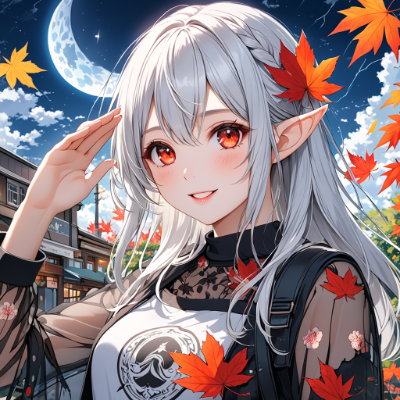 8K,((masterpiece,best quality,Ultra extremely detailed,perfect anatomy,detailed,high resolution)),((upper body,flower print,children female elf wearing Picture shirt,damaged jeans skirt,see-through sleeves)),looking at viewer,((red_Eye:1.5, Eye Reflections, reflect strong highlight in eyes)),waving shining long inner color white hair,hair_band,,elf ear,opening mouth,great smile,blush,lipstick,full fresh lips,big hip,small breasts,BREAK,many maple_leaves,many flowers,big moon,((shooting_star)),clouds,flushing lightning,cafe in town,<lora:hairdetailer:0> <lora:make25d_type1_v100:1> ,,
