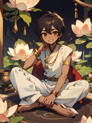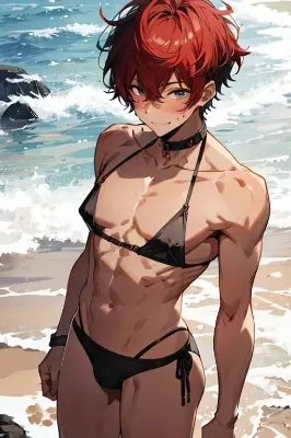absurdres, highres, ultra detailed, super fine illustration, best quality, 1boy, male focus, solo, 18 years old, (dark-skinned:1.0) male, red hair, short hair, blue eyes, babyface, topless, speedo, Low-rise, (bulge:1.3), bare shoulders, bare arms, bare legs, navel, nipples
