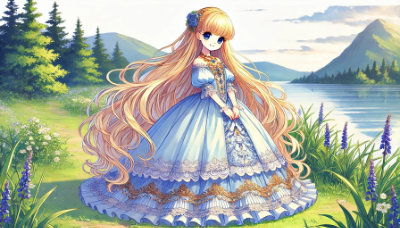 「1人のとても小柄な女性。とても背の低いお姫様で、とても長く明るい金髪、とても長くまっすぐ流れるようなストレートヘア。身長はとても低く、パステルピンクのドレスにはたっぷりとフリルが幾重にも重なり、長袖のパステルピンクのロングドレスは多くのフリルとレースと刺繍で豪華に飾られている。スカートの裾やウエスト部分にもフリルとレースと刺繍の装飾が豪華に施されて、裾まで華やかに広がっている。金銀や宝石のアクセサリーを多く付けている。非常に小柄な女性で可愛く、非常に低い背であり、顔を赤くして笑顔を浮かべている。湖畔の草原に立っている姿を横から見た絵。非常に長く明るい金髪のストレートヘアが広がっている。青い目。全体がアニメ風に描かれ、非常に詳細な描写。アスペクト比は縦長」の絵を描いて