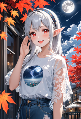 8K,((masterpiece,perfect anatomy,high resolution)),((close-up head from below,flower print,children female elf wearing Picture shirt,navy jacket,damaged jeans skirt,see-through sleeves)),looking at viewer,((red_Eye:1.5, reflect strong highlight in eyes)),waving shining long inner color white hair,hair_band,elf ear,opening mouth, smile,blush,full fresh lips,big hip,small breasts,salute,BREAK,many flowers,big moon,shooting_star,clouds,flushing lightning,cafe in town,<lora:hairdetailer:0> <lora:make25d_type1_v100:1> ,