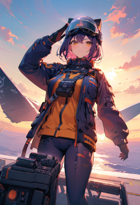 傑作, 最高品質, 超詳細な, masterpiece, more_details:-1, more_details:0, more_details:0.5, more_details:1, more_details:1.5, 1 pilot woman with medium breasts with helmet on head wearing military pilot uniform, standing on RF4C wing near the cockpit, looking at veiwer, making peace sign ,amazing sapraizz, extremely detailed ,