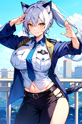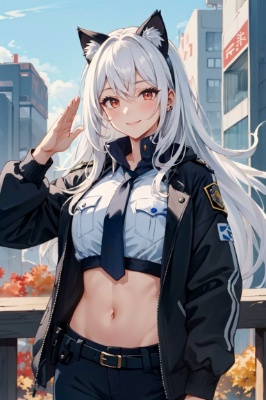 a pretty woman,shorthair,blue hair,red eyes,salute,big sister,original character,foreshortening,cyberpunk,autumn,day,blue sky,different world,clear sky,city(The alluring policewoman with cat ears smiles seductively and salutes.)