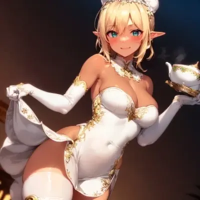 super fine illustration, an extremely cute and beautiful girl, elf, dark skin, highly detailed beautiful face and eyes, emeraldgreen eyes, beautiful long blonde hair, straight hair, blush, naughty smile, open mouth, fang, ahoge, flat chest, skinny, BREAK, white china dress, white thighhighsocks, white elbow gloves, dutch angle, cowboy shot, looking at viewer