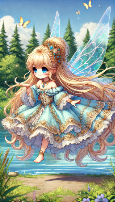 「1人のとても小柄な女性。とても背の低いお姫様で、とても長く明るい金髪、とても長くまっすぐ流れるようなストレートヘア。妖精の羽を持ち、身長はとても低く、薄いピンク色のドレスにはたっぷりとフリルが幾重にも重なり、長袖の薄いピンク色のロングドレスは多くのフリルとレースと刺繍で豪華に飾られている。スカートの裾やウエスト部分にもフリルとレースと刺繍の装飾が豪華に施されて、裾まで華やかに広がっている。金銀や宝石のアクセサリーを多く付けている。非常に小柄な女性で可愛く、非常に低い背であり、顔を赤くして笑顔を浮かべている。妖精の羽を持ち、湖畔の草原の近くの湖の上を飛んでいる。非常に長く明るい金髪のストレートヘアが広がっている。青い目。季節は春。とても背が低く、可愛いポーズをしている。全体がアニメ風に描かれ、非常に詳細な描写。アスペクト比は縦長」の絵を描いて