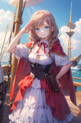 最近、なんか生成がうまくできなくて日付またいじゃったけど、昨日のお題「敬礼」にちなみ、他のうちの娘にも敬礼させてみました。 こちらは拙著、大航海時代風世界を舞台にした海洋冒険ファンタジー小説 『El Pirata Del Grimorio ~魔導書の海賊~』 (※下記URL参照) に登場する主要キャラの海賊の一人、東方人のカンフーロリ少女、陳露華(チェンルゥファ)。 敬礼というより手をかざして遠く見てる感じですけど(^^;