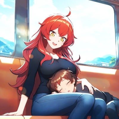 {game cg},best quality,very aesthetic,{1girl and 1boy},shota,yellow eyes,{tsurime},red hair,long hair,{{{messy hair}}},large breast,black shirt,open neck,long sleeves,denim pants,long pants,in train,sitting on seat,smile,open mouth,looking each other,speaking,looking away, best quality, amazing quality, very aesthetic, absurdres