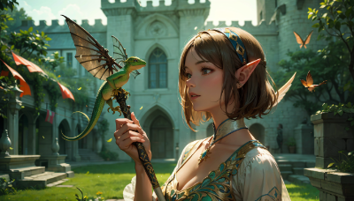 photograph of Wooden Building in Lauterbrunnen. The mountain peaks sparkle in the morning sun. The valley is shaded by the mountains. clear blue sky. The building is decorated with colorful flower planters. Small flowers swaying in the wind. river in the valley.