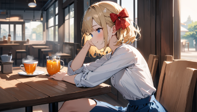 1girl, solo, walking, short hair, blonde hair, blue eyes, (hair bow:1.4),red bow,.big red bow on head, holding an umbrella, wearing a light blue raincoat, cute expression, slightly shivering, rain falling, puddles on the ground, rainy residential area, houses in the background, grey clouds, feeling chilly, close-up view, anime style, vibrant colors, detailed raindrops, playful pose, umbrella tilted slightly, boots splashing in puddles, best quality, amazing quality, very aesthetic, absurdres