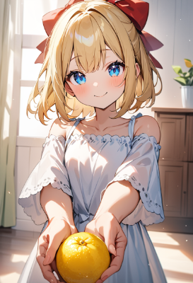 1girl,solo,anime style,short blonde hair,blue eyes,(hair bow:1.4),red bow,large red ribbon,chibi,kawaii,curious expression,surprised look,eyebrows raised,open mouth,walking pose,arms at sides,small breasts,white summer dress,lace trim,brown sandals,mountain path,dirt road,winding trail,lush green trees,summer sky,fluffy clouds,rusty large sword,ancient weapon,weathered blade,broken hilt,lying on ground,dappled sunlight,lens flare,soft shadows,dynamic angle,detailed background,jagged rocks,mountain peaks,wildflowers,grass blades,light wind,nature,outdoors,adventure mood,mid day,vibrant colors,sharp details,high quality,masterpiece,best quality,