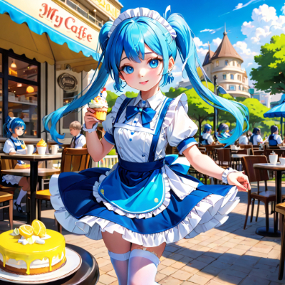 masterpiece,best quality,extremely detailed,anime, girl, skirt,blue hair,blue eyes,princess,light pink color lolita,white stockings,pumps,earrings,colorful,wink,Fashionable,cafe,alley,garter belt,rear view,rain,sky, <lora:hairdetailer:1> <lora:hime_style-1.0r8:1>,longhair
