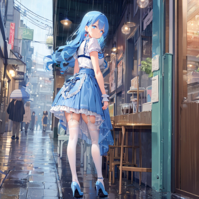 masterpiece,best quality,extremely detailed,anime, girl, skirt,blue hair,blue eyes,princess,light pink color lolita,white stockings,pumps,earrings,colorful,wink,Fashionable,cafe,alley,garter belt,rear view,rain,sky, <lora:hairdetailer:1> <lora:hime_style-1.0r8:1>,twintail