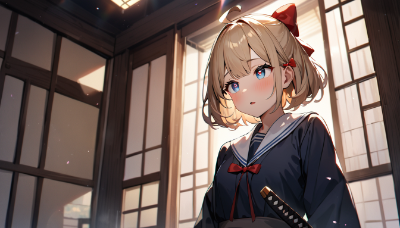 1girl,solo,looking_at_viewer,holding_sword,japanese_sword,serious_expression,short hair,blonde hair,blue eyes,(hair_bow:1.4),red_bow,detailed_kimono,detailed_background,masterpiece,best_quality,very_aesthetic,absurdres,