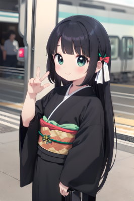 1 girl,(((very longest hair))),black hair, ,straight Hair,hair ribbon,mintgreen stripe,Black Eyes,flat chest,straight Across bangs,princess Cut, Very Long Sideburn,roundry Head,Droping eyes,cute,Meekness,Bob Cut,long back hair,12 years Old, smile,kimono,inner color hair, sword,(^_-)-☆,Wink