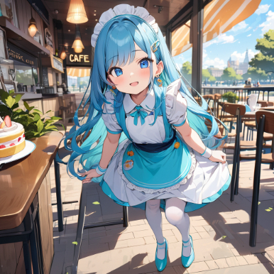 masterpiece,best quality,extremely detailed,anime, girl, skirt,blue hair,blue eyes,princess,maid,light pink color waitress uniform,white stockings,pumps,earrings,colorful,wink,Fashionable,sky,cafe,alley,garter belt,rear view, <lora:hairdetailer:1> <lora:hime_style-1.0r8:1>,kitten,ponytail
