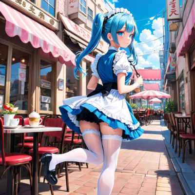 masterpiece,best quality,extremely detailed,anime, girl, skirt,blue hair,blue eyes,princess,light pink color lolita,white stockings,pumps,earrings,colorful,wink,Fashionable,cafe,alley,garter belt,rear view,rain, <lora:hairdetailer:1> <lora:hime_style-1.0r8:1>,sky,bobcut