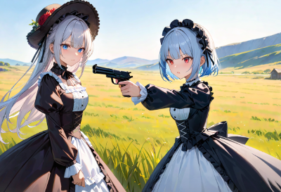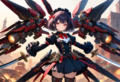 masterpiece, best quality, extremely detailed,girl,Chibi,cute,zettai ryouiki,black bob cot hair,red eyes,elaborately drawn eyes,mecha,science fiction,Military Look,black Lolita Fashion,mecha girl ,katana,dual wielding, mechanical wings, <lora:sensualface_type2:1>