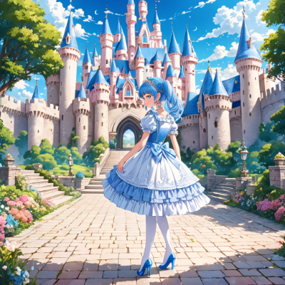 masterpiece,best quality,extremely detailed,anime, girl, skirt,blue hair,blue eyes,princess,maid,light pink color waitress uniform,white stockings,pumps,earrings,colorful,wink,my child,Fashionable,sky,cafe,alley,rain , , <lora:hairdetailer:1> <lora:hime_style-1.0r8:1>,bobcut