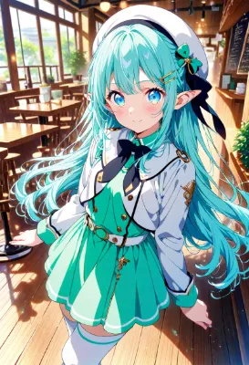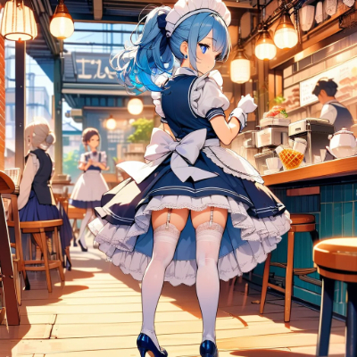 masterpiece,best quality,extremely detailed,anime, girl, skirt,blue hair,blue eyes,princess,maid,light pink color waitress uniform,white stockings,pumps,earrings,colorful,wink,Fashionable,sky,cafe,alley,garter belt,rear view,kitten,night,rain, , <lora:hairdetailer:1> <lora:hime_style-1.0r8:1>,ponytail