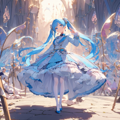 masterpiece,best quality,extremely detailed,anime,girl,skirt,blue hair,blue eyes,princess,white stockings,pumps,earrings,colorful,wink,Fashionable,rear view,light pink color Lolita Fashion,fantasy,different world,Twinkling, inner color hair,battle,samurai sword, ,ruins, <lora:hairdetailer:1> <lora:hime_style-1.0r8:1>,ponytail
