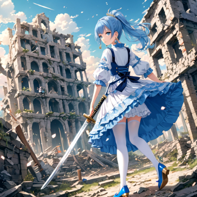 masterpiece,best quality,extremely detailed,anime,girl,skirt,blue hair,blue eyes,princess,white stockings,pumps,earrings,colorful,wink,Fashionable,garter belt,rear view,Military Look,light pink color Lolita Fashion,ruins,fantasy,starry sky, , , <lora:hairdetailer:1> <lora:hime_style-1.0r8:1>,ponytail