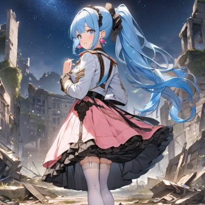 masterpiece,best quality,extremely detailed,anime,girl,skirt,blue hair,blue eyes,princess,white stockings,pumps,earrings,colorful,wink,Fashionable,rear view,light pink color Lolita Fashion,fantasy,dark,different world, ,castle <lora:hairdetailer:1> <lora:hime_style-1.0r8:1>,bobcut