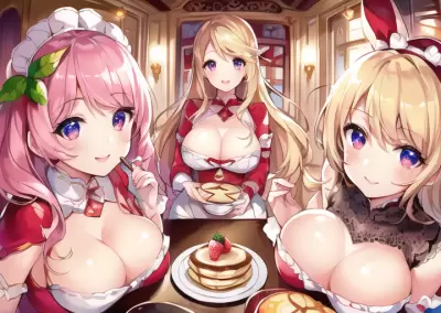 (extremely detailed,masterpiece, best quality, ultra-detailed),(best illumination, best shadow, an extremely delicate and beautiful), (photorealistic, painting, realistic, sketch,portrait),cinematic lighting, dynamic angle, floating, finely detail,(bloom), (shine),thick line,painting,///,loli,small,little young female, (((4 girls))),teen,kawaii,seductive smile with open mouth,delicated eye,baby doll,Strawberry cream pancake ,Strawberry pancake with amount of cream,green tea,///,ketchen, cafe, colorful items,realistic and detailed cooking tools,eye focused,(fish eye lens),kyoto cafe,maid,kimono
