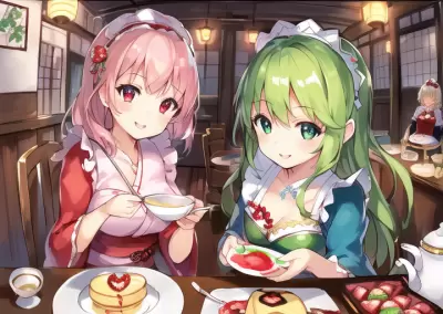 (extremely detailed,masterpiece, best quality, ultra-detailed),(best illumination, best shadow, an extremely delicate and beautiful), (photorealistic, painting, realistic, sketch,portrait),cinematic lighting, dynamic angle, floating, finely detail,(bloom), (shine),thick line,painting,///,loli,small,little young female, (((4 girls))),teen,kawaii,seductive smile with open mouth,delicated eye,baby doll,Strawberry cream pancake ,Strawberry pancake with amount of cream,green tea,///,ketchen, cafe, colorful items,realistic and detailed cooking tools,eye focused,(fish eye lens),kyoto cafe,maid,kimono