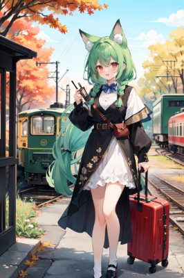 girl,tail,blonde hair,green eyes,train,station,luggage,fox girl,ojou-sama,original character,watercolor,steampunk,winter,different world(A beautiful girl with fox ears happily embarks on a fantastic time travel journey on a steam locomotive.)