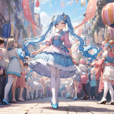 masterpiece,best quality,extremely detailed,anime,girl,skirt,blue hair,blue eyes,princess,white stockings,pumps,earrings,colorful,wink,Fashionable,rear view,light pink color Lolita Fashion,fantasy,different world,Twinkling, inner color hair,battle,sword, ,train,station,luggage , <lora:hairdetailer:1> <lora:hime_style-1.0r8:1>,longhair