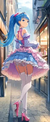 masterpiece,best quality,extremely detailed,anime, girl, skirt,blue hair,blue eyes,princess,maid,light pink color waitress uniform,white stockings,pumps,earrings,colorful,wink,Fashionable,sky,cafe,alley,garter belt,rear view,night,rain, , , <lora:hairdetailer:1> <lora:hime_style-1.0r8:1>,ponytail