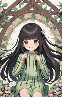 1 girl,(((very longest hair))),black hair, ,straight Hair,hair ribbon,mintgreen stripe,Black Eyes,flat chest,straight Across bangs,princess Cut, Very Long Sideburn,roundry Head,Droping eyes,cute,Meekness,Bob Cut,long back hair,12 years Old, smile,kimono,inner color hair, ,painting,drawing,canvas