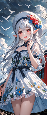 8K,((masterpiece,best quality,Ultra extremely detailed,perfect anatomy,detailed,high resolution)),((from below,flower print,children female elf wearing see-through cloth dress ,see-through sleeves,see-through frill skirt)),looking at viewer,((red_Eye:1.5, Eye Reflections, reflect strong highlight in eyes)),waving shining long inner color white hair,hair_band,elf ear,opening mouth,great smile,blush,lipstick,full fresh lips,big hip,small breasts,holding own hip,white large hat,BREAK,in the station,many birds,clouds,dark clouds,flushing lightning ,strong wind,near large long many travel trains in picture frame,railroads,lake in distance,<lora:hairdetailer:0> <lora:make25d_type1_v100:1> ,