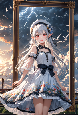 8K,((picture frame,masterpiece,best quality,Ultra extremely detailed,perfect anatomy,detailed,high resolution)),((from below in picture frame,flower print,children female elf wearing see-through cloth dress ,see-through sleeves,see-through frill skirt)),looking at viewer,((red_Eye:1.5, Eye Reflections, reflect strong highlight in eyes)),waving shining long inner color white hair,hair_band,elf ear,opening mouth,great smile,blush,lipstick,full fresh lips,big hip,small breasts,holding own hip,white large hat,BREAK,in the picture frame,many birds,clouds,dark clouds,flushing lightning ,strong wind,near large long many travel trains in picture frame,<lora:hairdetailer:0> <lora:make25d_type1_v100:1> ,