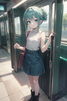 masterpiece, best quality, highres, 1otoko no ko, solo, yellow cardigan, sleeve past wrists, (brown pleated skirt:1.3), loose socks, loafers, school bag, かわいい, flat chest, (aqua hair:1.2), aqua eyes, half updo, smile, 16 yo, nice hands, perfect hands, town<lora:flat2:0><lora:hairdetailer:0.5><lora:GoodHands-vanilla:1> <lora:superbaggysocks:1>