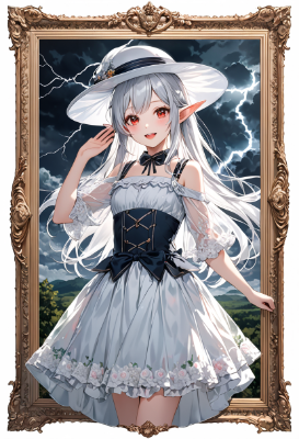 8K,((picture frame,masterpiece,best quality,Ultra extremely detailed,perfect anatomy,detailed,high resolution)),((close-up body in picture frame,flower print,children female elf wearing see-through sweater dress ,see-through sleeves, frill Knit skirt)),looking at viewer,((red_Eye:1.5, Eye Reflections, reflect strong highlight in eyes)),waving shining long inner color white hair,hair_band,elf ear,opening mouth,great smile,blush,lipstick,full fresh lips,big hip,small breasts,white knitted hat,BREAK,in the picture frame,many birds,clouds,dark clouds,flushing lightning ,strong wind,reflecting view of rail road and station in the picture frame,in the blizzard,<lora:hairdetailer:0> <lora:make25d_type1_v100:1> ,
