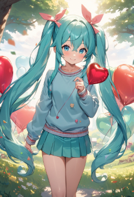 masterpiece, best quality, extremely detailed, anime, girl, skirtHatsune Miku, vocaloid, 1 girl, twin tails, long hair, blue hair, green hair, blue eyes, smiling Hatsune Miku standing under a big apple tree on a small hill in the prairie. I'm holding a red heart shaped balloon in my hand,mini skirt,twintail,longhair,sweater,fantasy,autumn