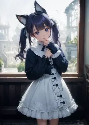 side up short twintail,curly hair,diagonal bangs,purple-haired,blue eye,cat ear,