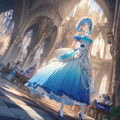 masterpiece,best quality,extremely detailed,anime,girl,skirt,blue hair,blue eyes,princess,white stockings,pumps,earrings,colorful,wink,Fashionable,rear view,light pink color Lolita Fashion,fantasy,different world,Twinkling, ,inner color hair,festival , <lora:hairdetailer:1> <lora:hime_style-1.0r8:1>,twintail