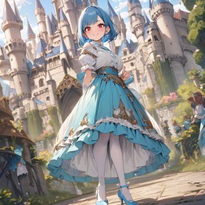 masterpiece,best quality,extremely detailed,anime,girl,skirt,princess,gradation color dress,white stockings,pumps,earrings,colorful,makeup,wink,fantasy,castle,blue hair,blue eyes ,garter belt <lora:hime_style-1.0r8:1> <lora:hairdetailer:1>,church,bobcut