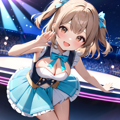 (best quality), (beautiful), (masterpiece), petite, 1girl, upper body above the knees, (pastel blue exposed fantastic idol costume:1.2), light smile, closed mouth, light brown hair, medium hair, wave hair, two side up with ribbon, dark brown eyes, large breasts, looking at viewer, cheerful pose, outdoor stage, from side above