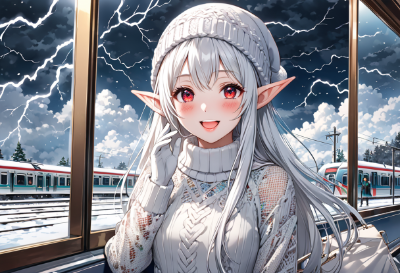 8K,((masterpiece,best quality,Ultra extremely detailed,perfect anatomy,detailed,high resolution,detailed clothing,highres)),((close-up eyes,flower print,children female elf wearing see-through sweater dress ,see-through sleeves, frill Knit skirt,white knit glove)),looking at viewer,((red_Eye:1.5, Eye Reflections, reflect strong highlight in eyes)),waving shining long inner color white hair,hair_band,elf ear,opening mouth,great smile,blush,lipstick,full fresh lips,big hip,small breasts,white knitted hat,BREAK,many birds,clouds,dark clouds,flushing lightning ,strong wind,reflecting view of rail road and station,in the blizzard,<lora:hairdetailer:0> <lora:make25d_type1_v100:1> ,,