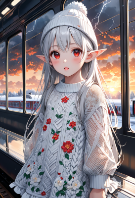 2 female elves,8K,((masterpiece,best quality,Ultra extremely detailed,perfect anatomy,detailed,high resolution,detailed clothing,highres)),((close-up eyes,flower print,children female elf wearing see-through sweater dress ,see-through sleeves, frill Knit skirt,white knit glove)),looking at viewer,((red Eye, Eye Reflections, reflect strong highlight in eyes)),waving shining long inner color white hair,hair_band,elf ear,opening mouth,great smile,blush,lipstick,full fresh lips,big hip,small breasts,white knitted hat,BREAK,in train,many birds,clouds,dark clouds,flushing lightning ,strong wind,steam train ,reflecting view of rail road and station,in the blizzard,<lora:hairdetailer:0> <lora:make25d_type1_v100:1> ,,,