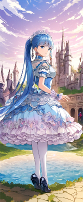 masterpiece,best quality,extremely detailed,anime,girl,skirt,princess,white stockings,pumps,earrings,colorful,makeup,wink,fantasy,castle,blue hair,red eye , , , <lora:hime_style-1.0r8:1> <lora:hairdetailer:1>,bobcut