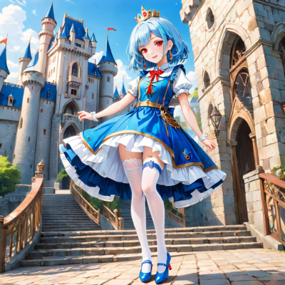 masterpiece,best quality,extremely detailed,anime,girl,skirt,blue hair,blue eyes,princess,white stockings,pumps,earrings,colorful,wink,Fashionable,rear view,light pink color Lolita Fashion,fantasy,dark,different world, ,castle <lora:hairdetailer:1> <lora:hime_style-1.0r8:1>,ponytail
