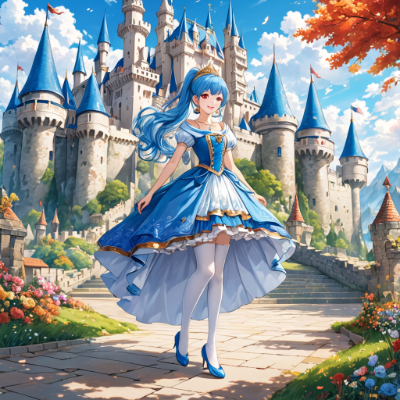 masterpiece,best quality,extremely detailed,anime, girl, skirt,blue hair,blue eyes,princess,maid,fluorescent color waitress uniform,white stockings,pumps,earrings,colorful,wink,my child,Fashionable,sky,cafe,park,lemon cake , <lora:hairdetailer:0.7> <lora:hime_style-1.0r8:1>,longhair