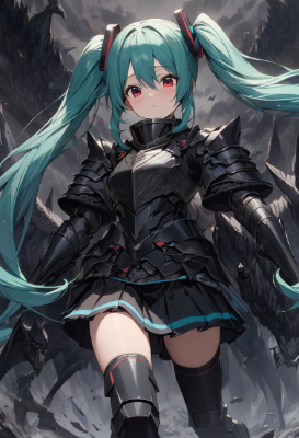 masterpiece, best quality, extremely detailed, anime, girl, Hatsune Miku, vocaloid, 1girl, twin tails, long hair, , , , a knight girl wearing jet black armor riding a black dragon. dark cloudy sky, rough black earth, dark world, dark knight, dark fantasy,red eyes,skirt,mini skirt,twintail,longhair,red eye,手に漆黒の剣を持っている。,blue hair,green hair,sword,female knight